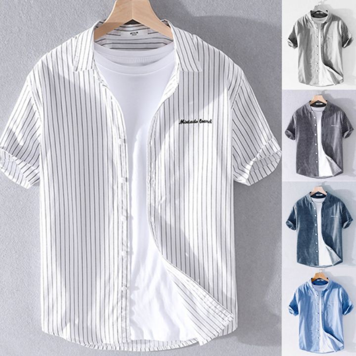 Tag : Áo sơ mi nam tay ngắn kẻ sọc phối chữ mẫu mới cực hot thời trang nam PONIVALAZA chất vải lụa