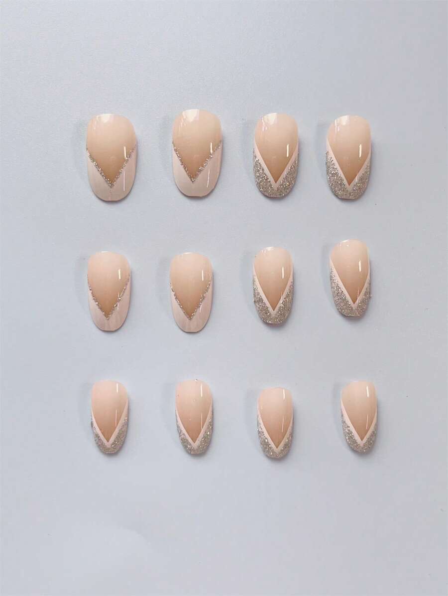 Tag : 24pcs Nude Color False Nails Set With French V Shape White Tip And Silver Glitter Decor
