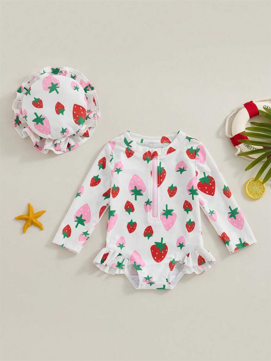Tag : 2Pcs Baby Girls Swimsuit Strawberry Print Long Sleeve Bikini With Hat Newborn Swimwear For