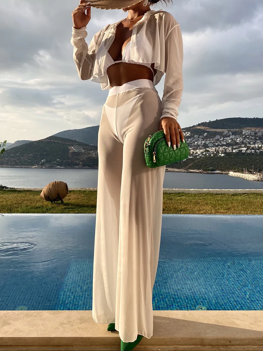 Tag : 4 Pieces Lace Up Halter Triangle Bikini Swimsuit Cover Up With Pants Sexy Swimwear Women 2024