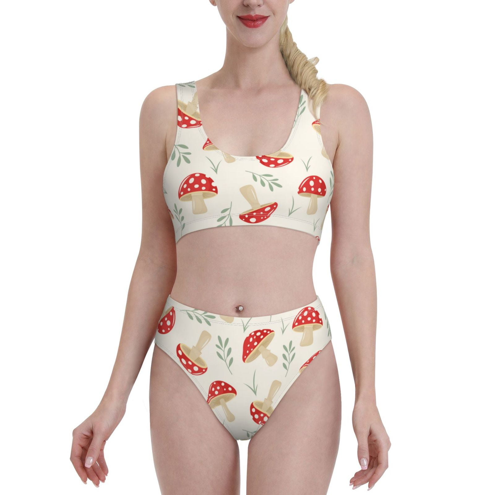 Adobk Cartoon Flat Mushrooms Print Women High Waisted Bikini Set Sports Swimsuit Bathing Suit X is a popular picture for sexy and hot.