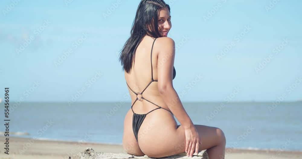 Amazing Latina Sits On A Log At The Beach Before Turning Around With A Smile In A Black Bikini is a popular picture for sexy and hot.