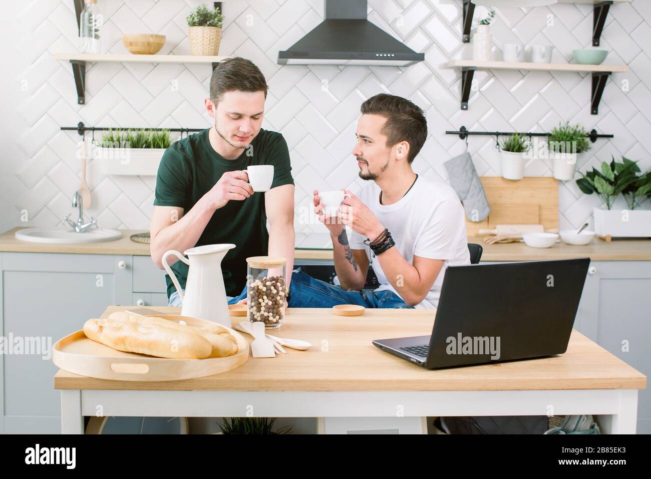 An Image Of Gay Couple In Kitchen Attractive Caucasian Men Drinking Coffee And Working On is a popular picture for sexy and hot.