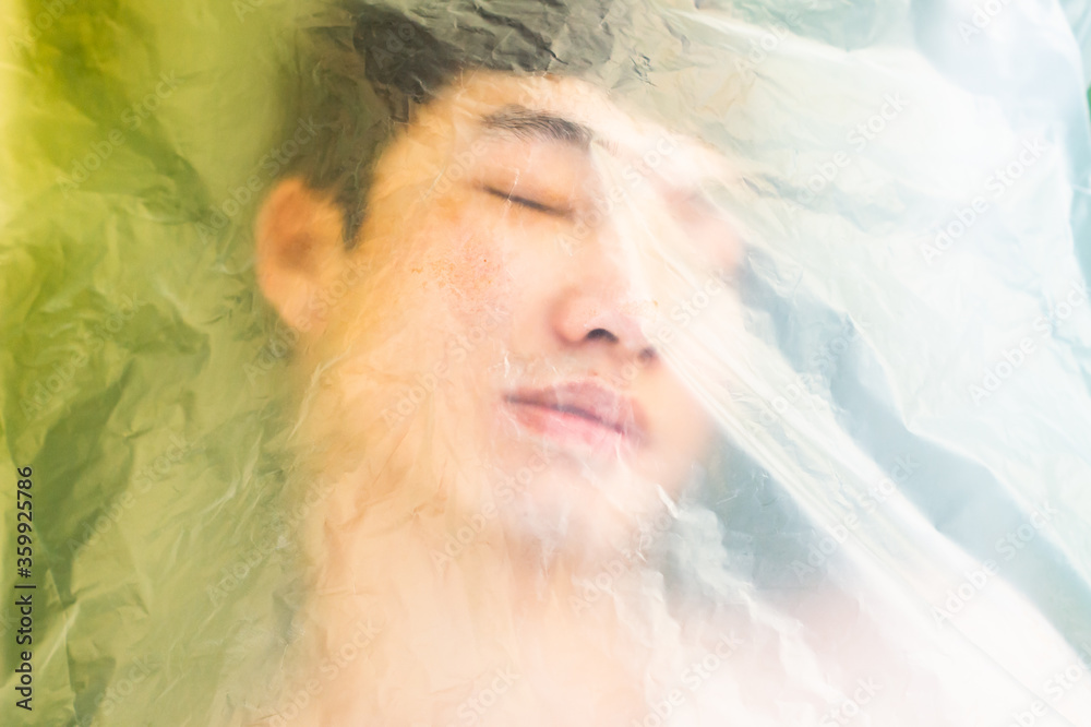 Asian Gay Man Is Wearing A Plastic Bag On His Head That Has Suffocated A Concept To Stop Using is a popular picture for sexy and hot.
