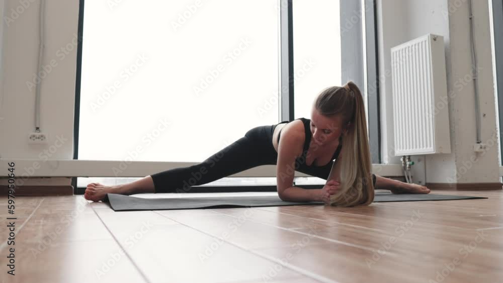 Beautiful Blonde Female In Tight Yoga Clothing Extending In Wide Angle Seated Forward Bend Pose is a popular picture for sexy and hot.