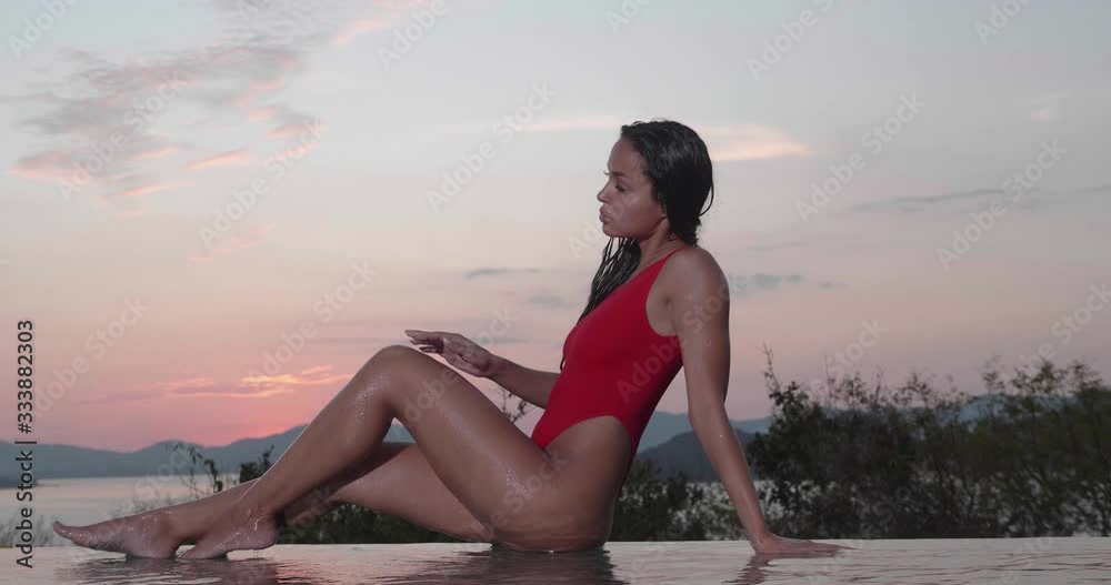Beautiful Brunette Woman In Red Swimsuit Posing By Outdoor Pool Over Sunset Sky Background is a popular picture for sexy and hot.