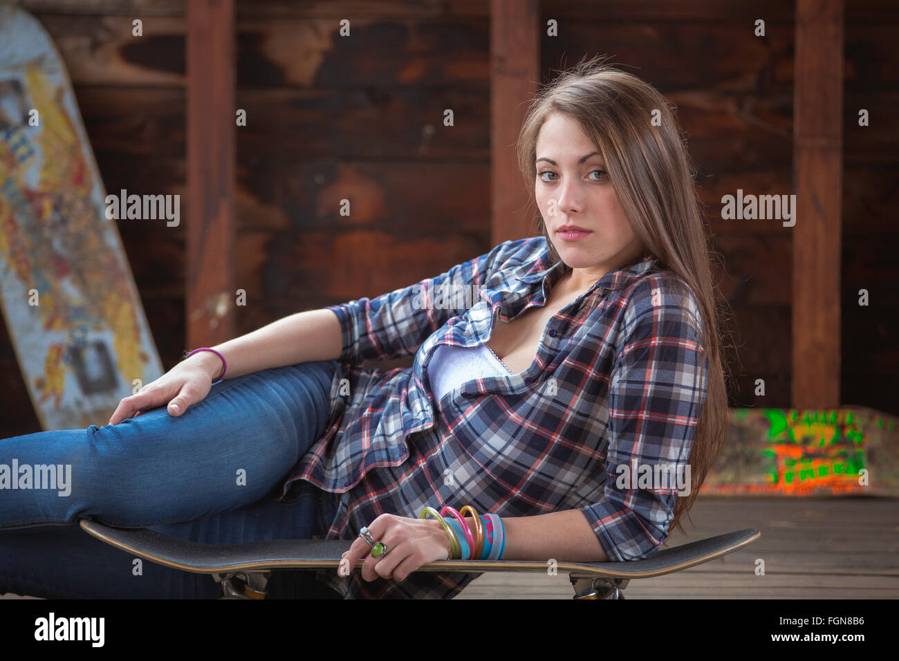 Beautiful Brunette Woman Leaning On A Skateboard Stock Photo Alamy 137412