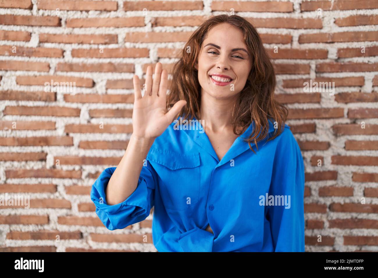 Tag : Beautiful Brunette Woman Standing Over Bricks Wall Waiving Saying Hello Happy And Smiling
