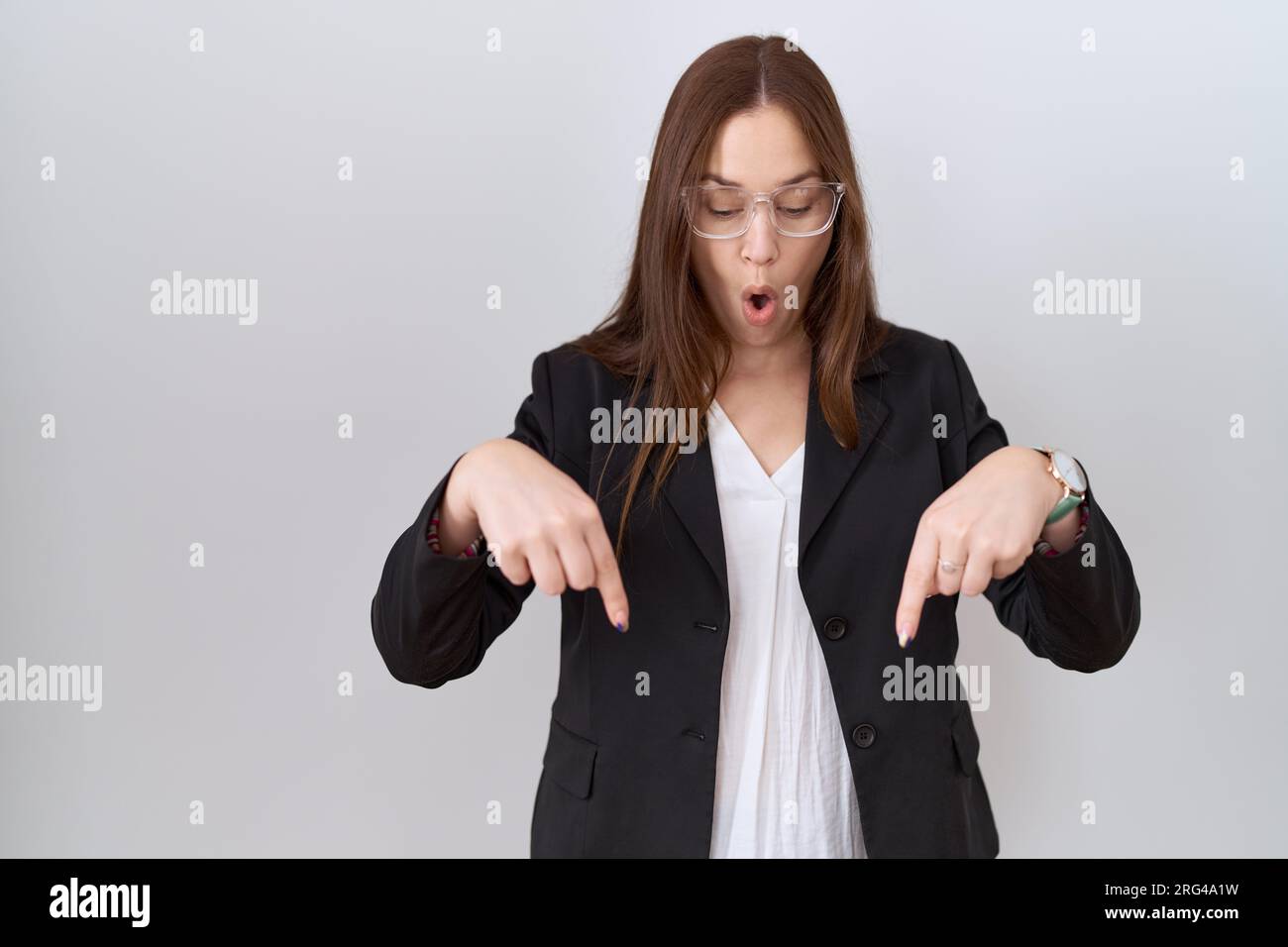 Tag : Beautiful Brunette Woman Wearing Business Jacket And Glasses Pointing Down With Fingers Showing