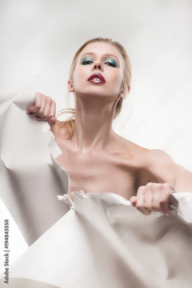 Beautiful Topless Girl Tears A Large Sheet Of White Whatman Paper And Covers With It Her Naked 221088