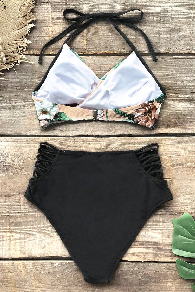 Tag : Bikini Halter Floral Rosado Con Fondo Negro De Tiras