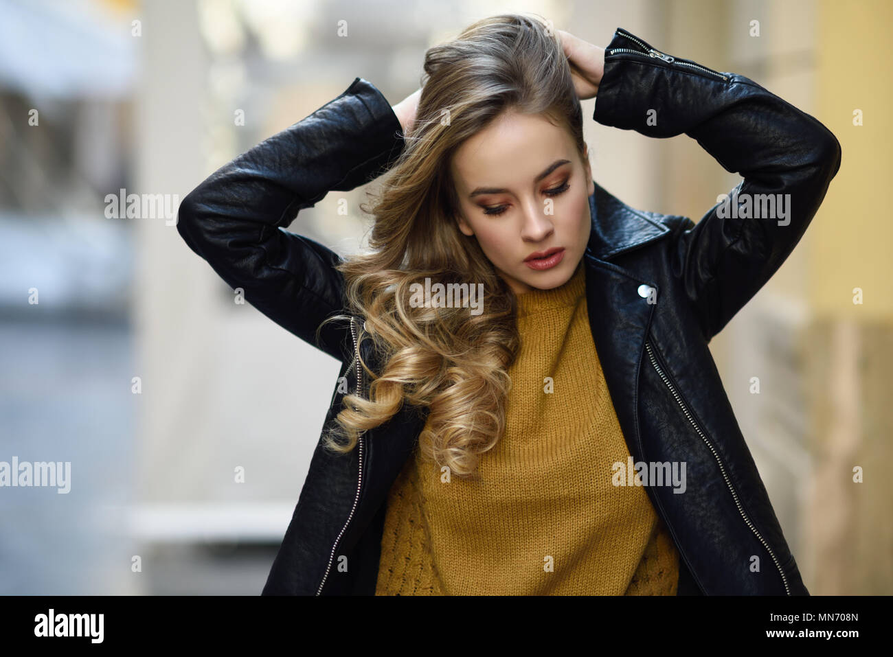 Blonde Frau im städtischen Hintergrund Schöne junge Mädchen mit schwarzen leder jacke und mini is a popular picture for sexy and hot.