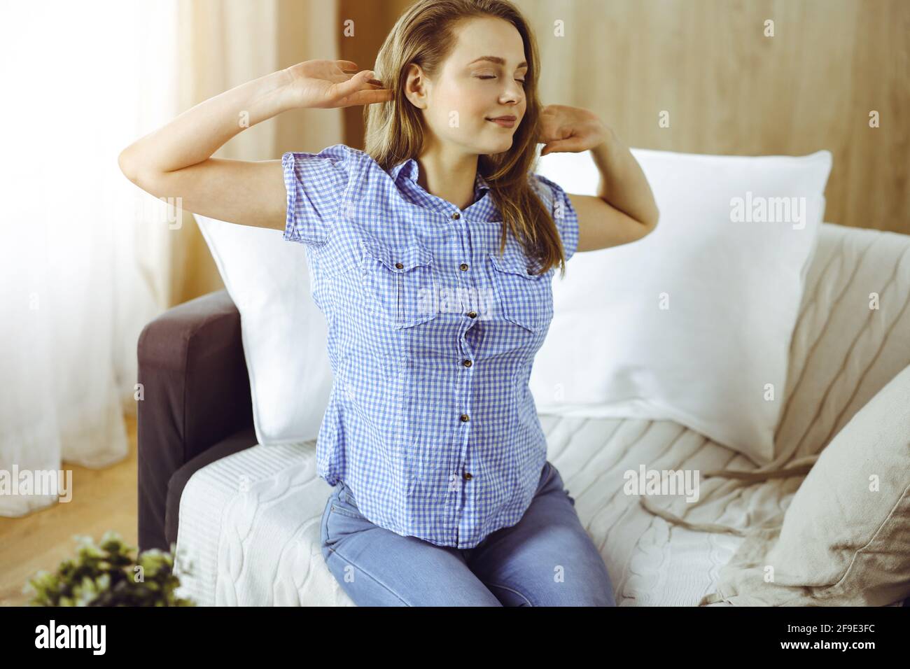 Bonne femme blonde a mis les mains derrière la tête penchée canapé caucasienne femme profitez d 233541