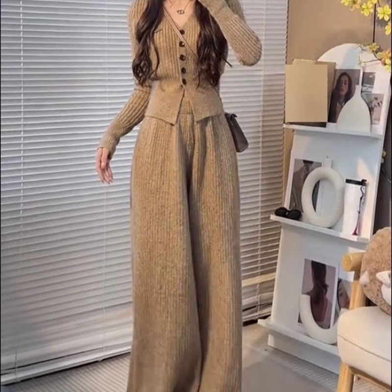 Có Sẵn Set Bộ len lông thỏ cao cấp áo mix quần ống rộng hot trend thu đông Shopee Việt Nam