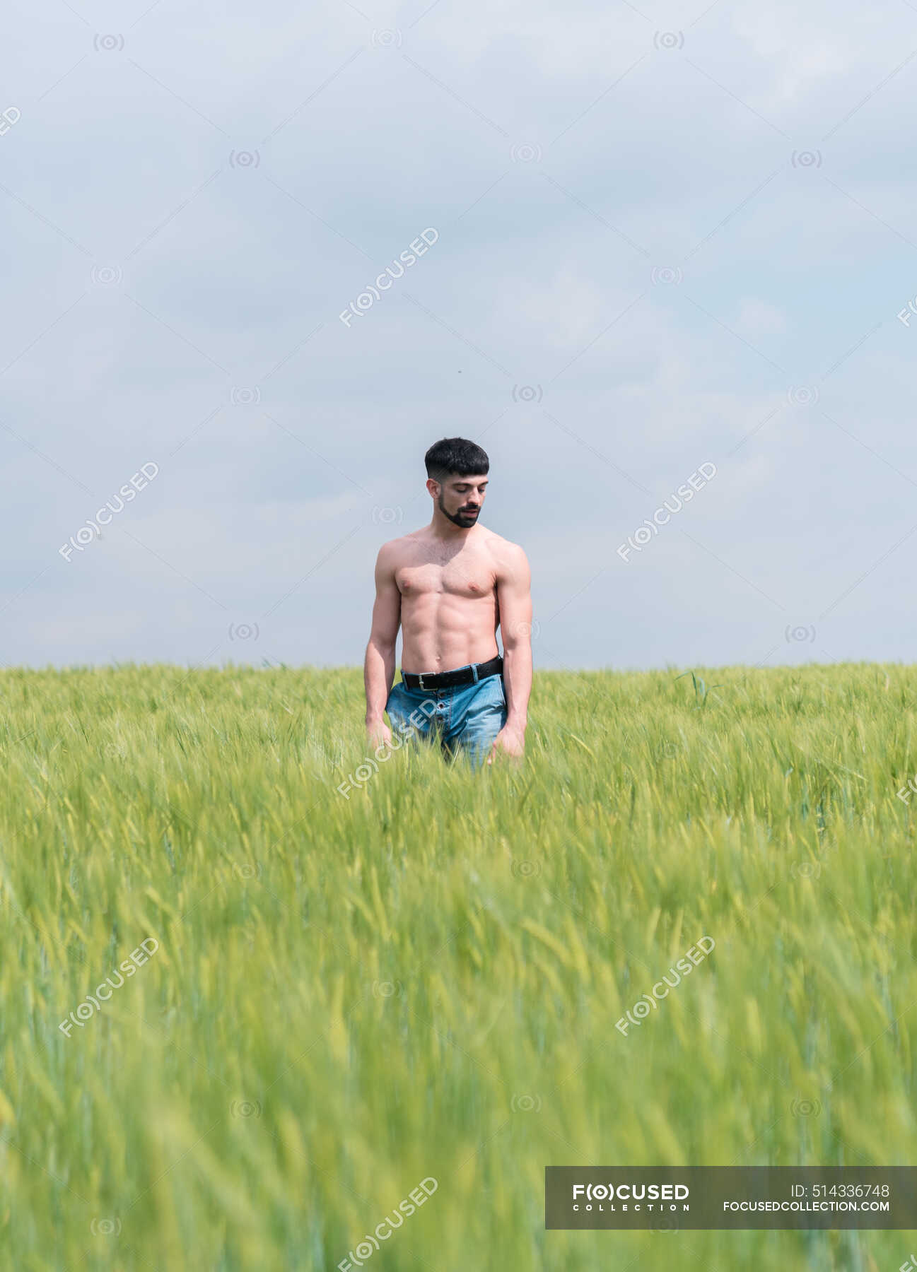 Tag : Calm Man With Naked Muscular Torso Touching Tops Of Grass Walking In Green Field Against Cloudy