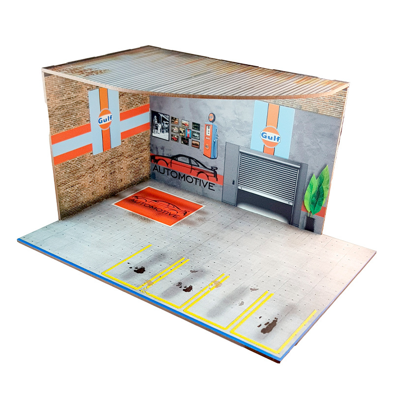 Cenário para Diorama expositor acrílico padrão Hot Wheels Oficina Gulf Cast em escala 1