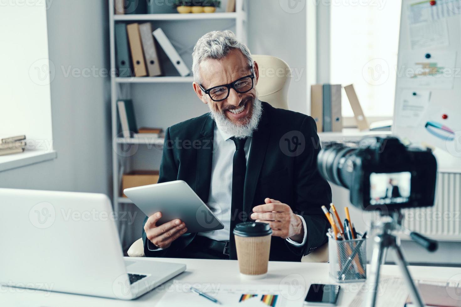 Confident Mature Man In Elegant Suit Telling Something And Smiling While Making Social Media is a popular picture for sexy and hot.