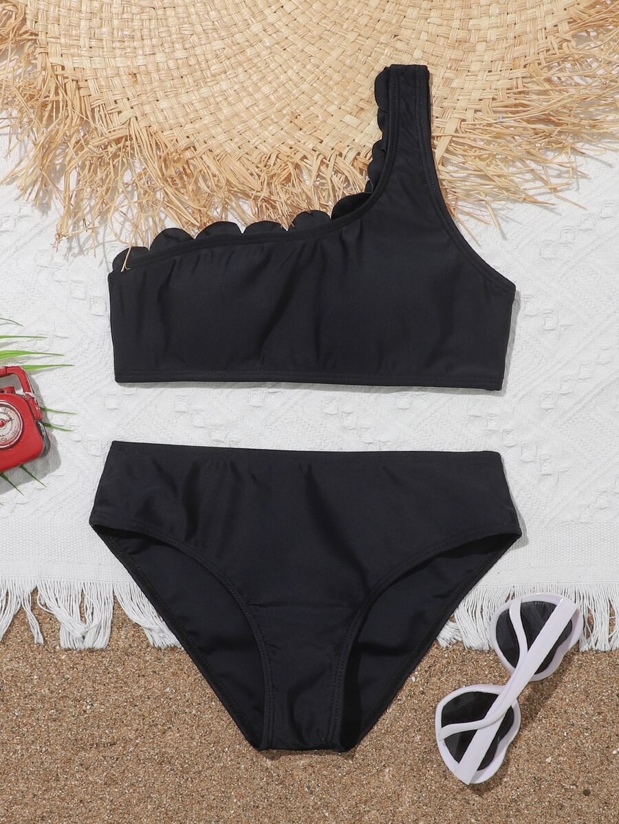 Tag : Conjunto de bikini de escote festoneado liso para niña preadolescente verano playa Moda de