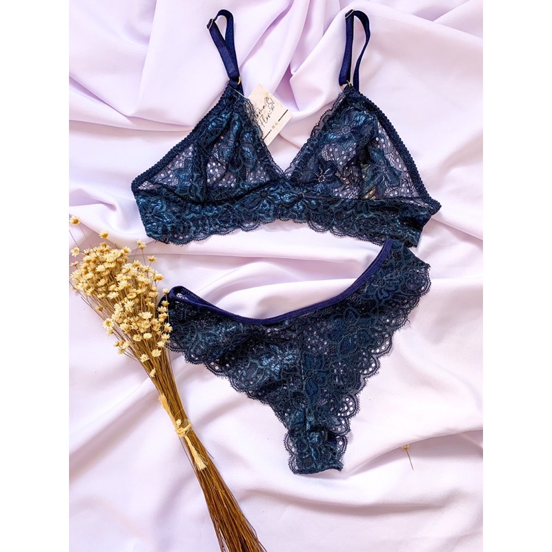 Tag : Conjunto de lingerie todo de renda sutiã sem bojo e calcinha fio