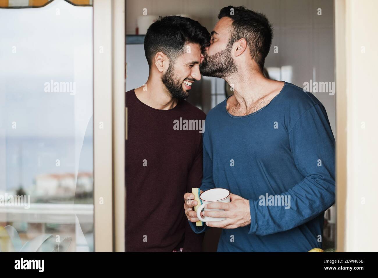 Tag : Couple gay masculin ayant un moment tendre tout en lavant la vaisselle à l intérieur Cuisine