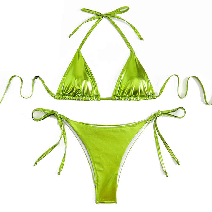 Tag : Custom Metallic Shiny Sexy Glitter String Bikini Beachwear Solid Color Quick Dry Tie Thong