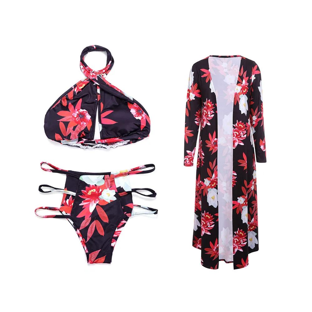 Custom Three Piece Swimsuit Bikini Set Chiffon Sarong Cappa For Womens Print Floral Beachwear is a popular picture for sexy and hot.