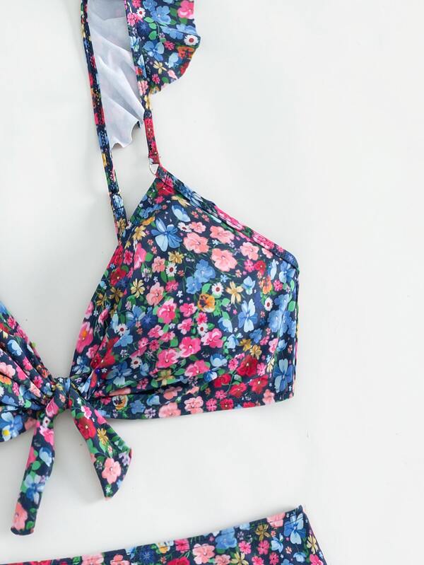 Tag : Ditsy Floral Print Bikini Set Ruffle Trim Knot Wireless Bra Skirt Piece Swimsuit SHEIN USA