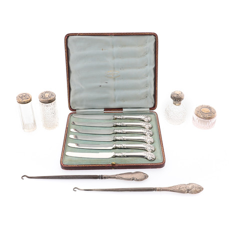 Tag : EN FÖRGYLLD VERKTYGSLÄDER HÖLJE UPPSÄTTNING AV SEX SILVER PISTOL HANTERADE TE KNIVAR Silver