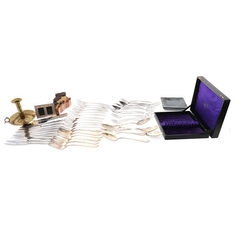 EN TYSK UPPSÄTTNING AV SEX ELEKTROPLATTA PÄRLA KANT BORDSSKEDAR OCH SEX MATCHANDE BORDSGAFFLAR