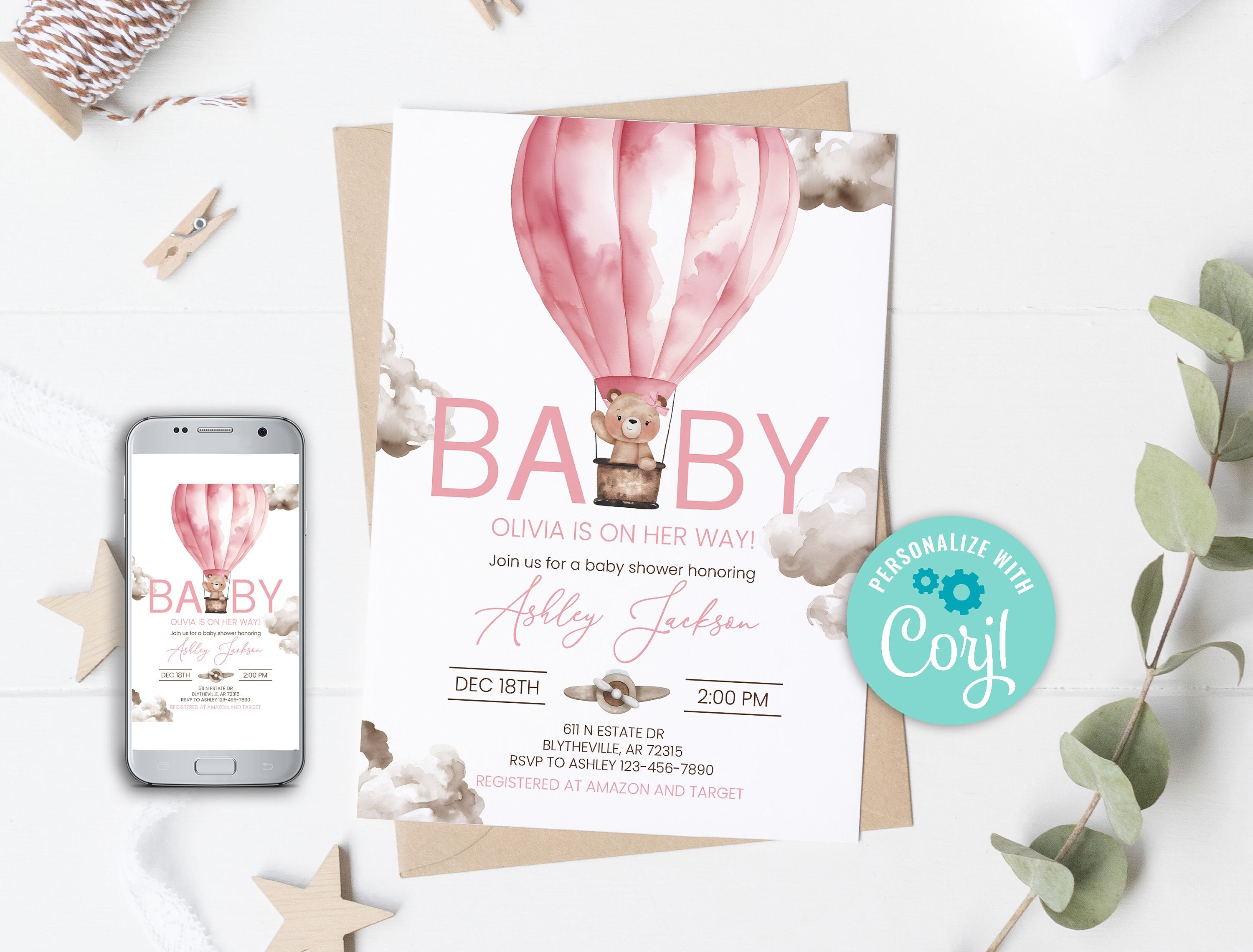 Tag : Editable Bear Hot Air Balloon Baby Shower Invitation Girl Bear We Can Bearly Wait Baby Shower