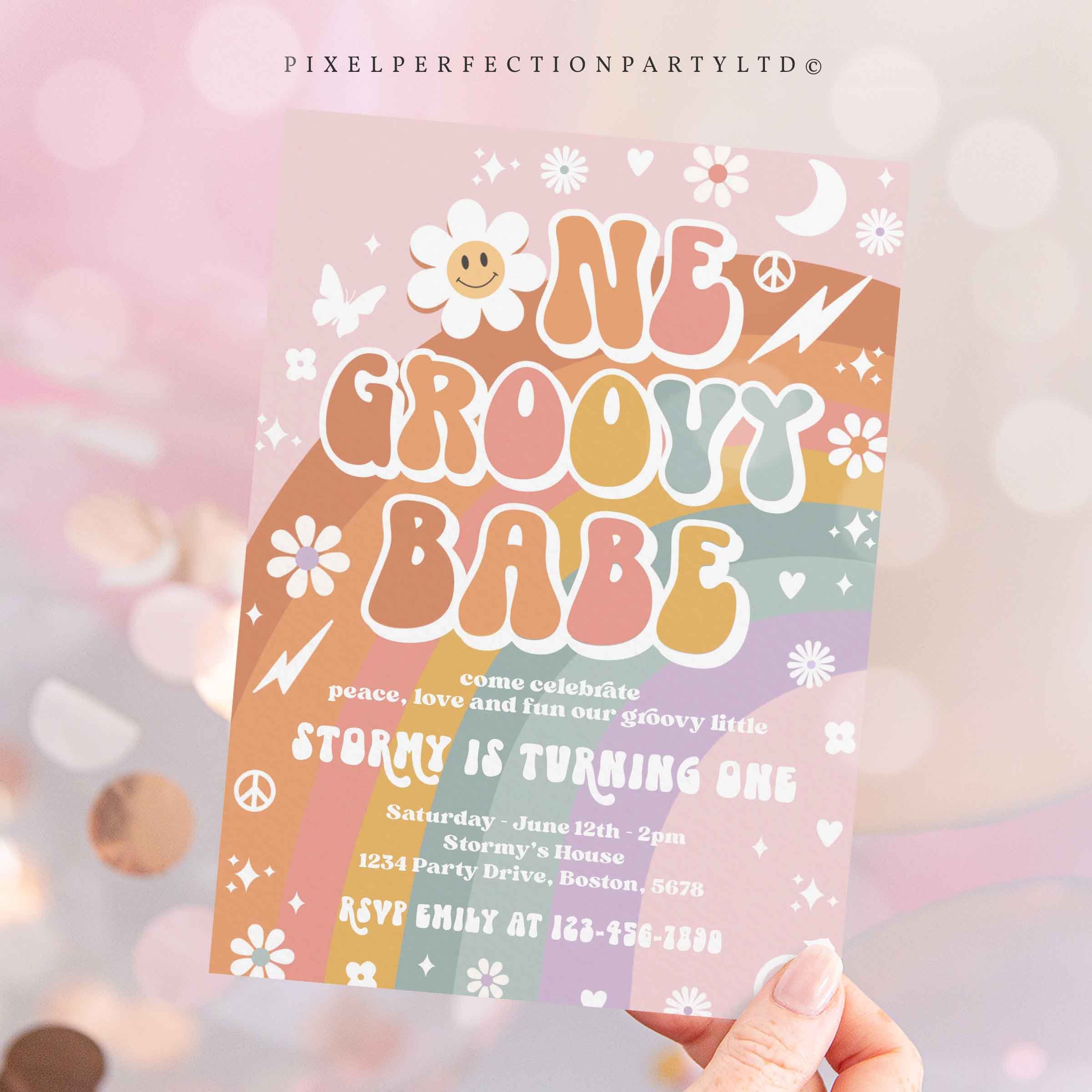 Tag : Editable One Groovy Babe Birthday Party Invitation Groovy One Birthday Groovy Rainbow Party