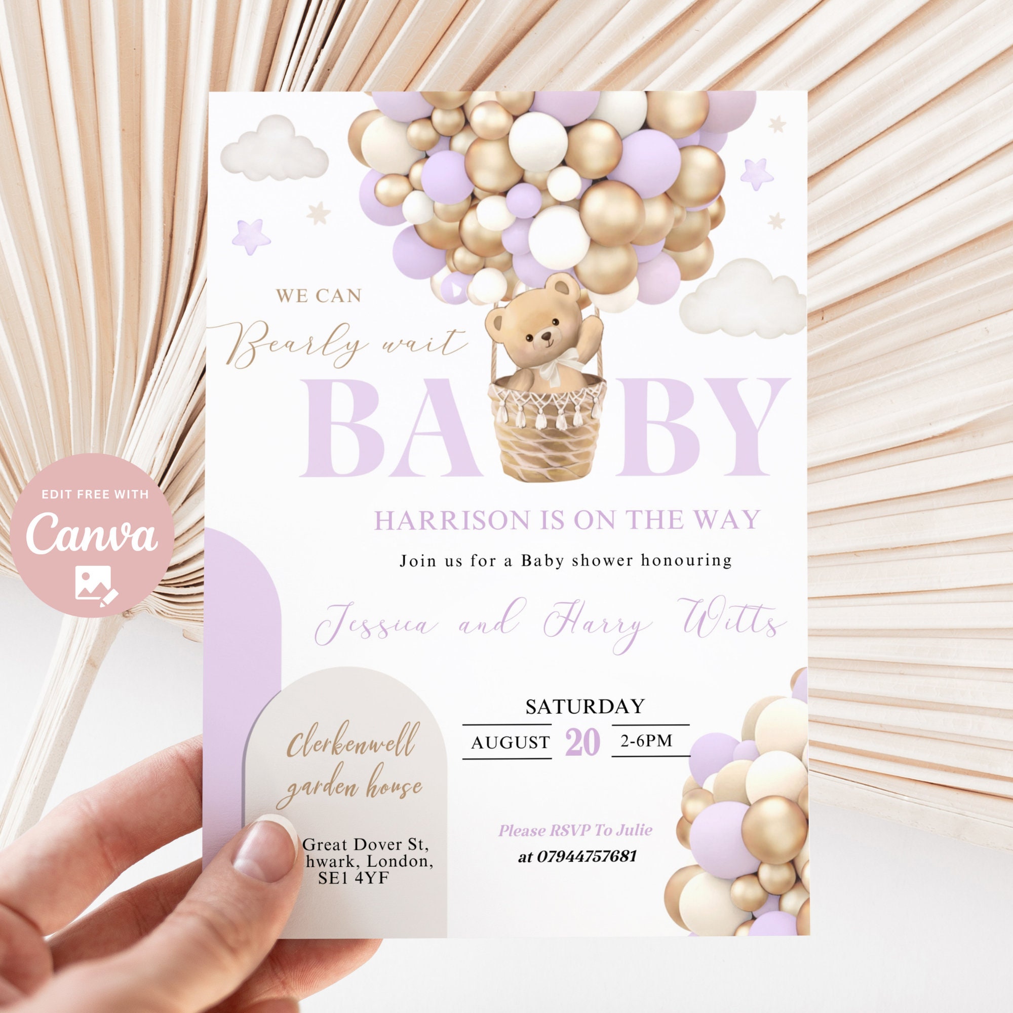 Tag : Editable We Can Bearly Wait Baby Shower Invite Hot Air Balloon Lilac Girl Teddy Bear Theme Boho