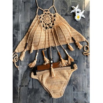 Emmiol Free Shipping 2025 Fringed Halter Crochet Knit Bikini Top Khaki M In Bikini Sets Online is a popular picture for sexy and hot.