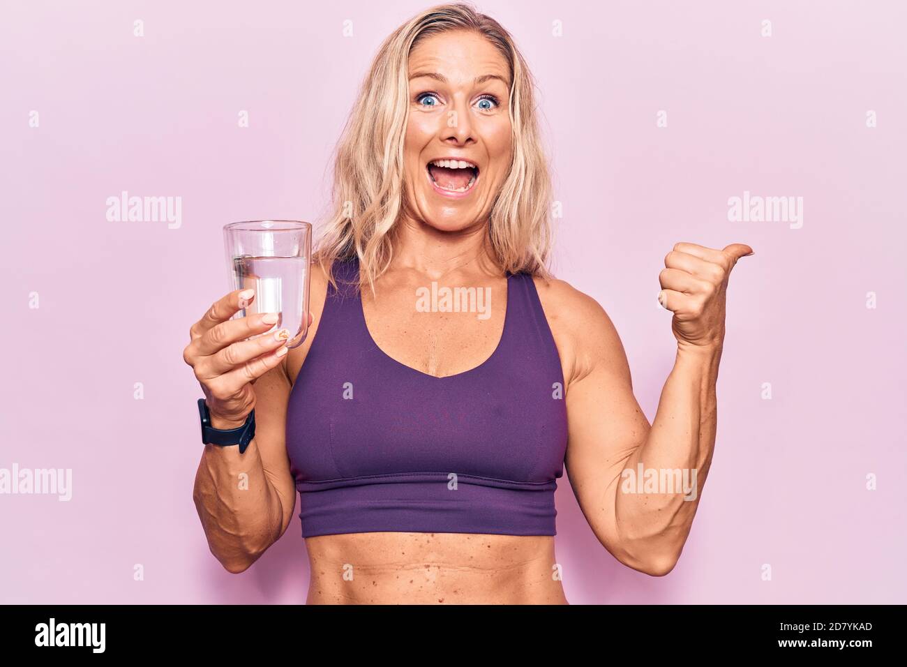 Related pictures for Femme blonde d âge moyen de race blanche qui boit un verre d eau pointant le pouce jusqu au côté