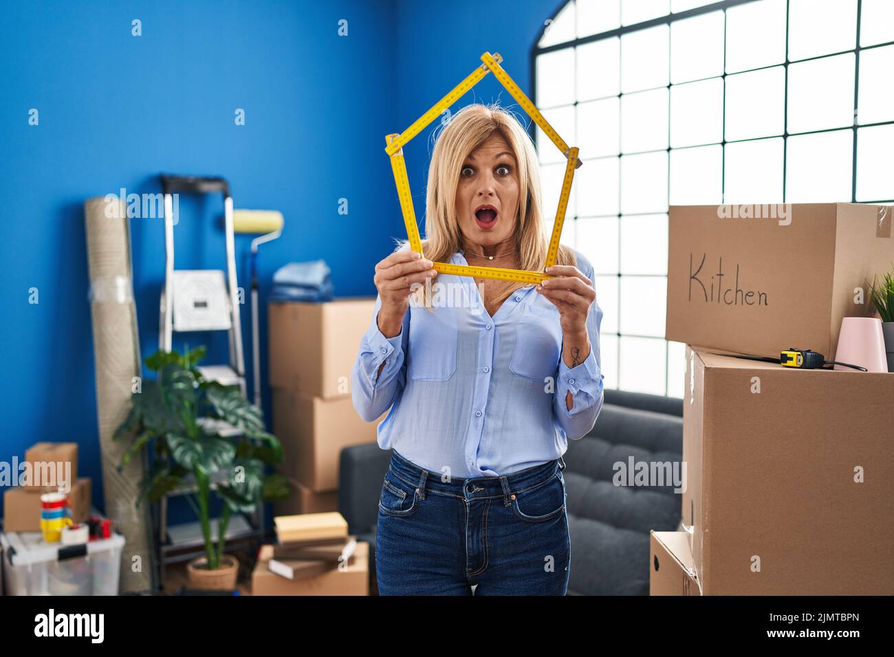 Tag : Femme blonde d âge moyen se déplaçant à une nouvelle maison peur et choqué avec la surprise et l