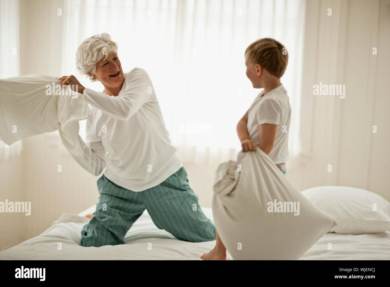 Tag : Femme mature et un jeune garçon ont un oreiller lutte sur un lit Photo Stock Alamy