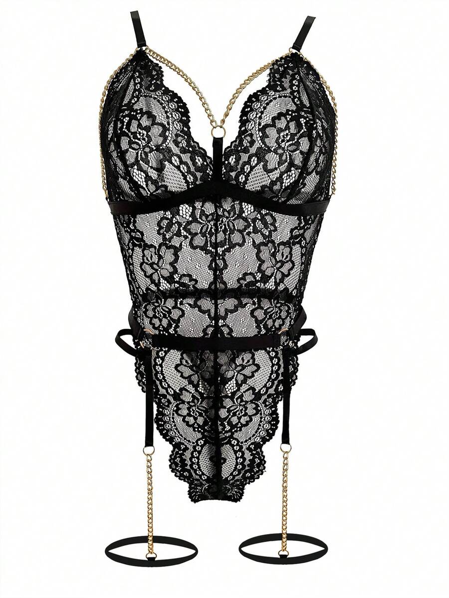 Tag : Floral Lace Chain Linked Garter Teddy Bodysuit With Pair Leg Ring Lingerie SHEIN USA