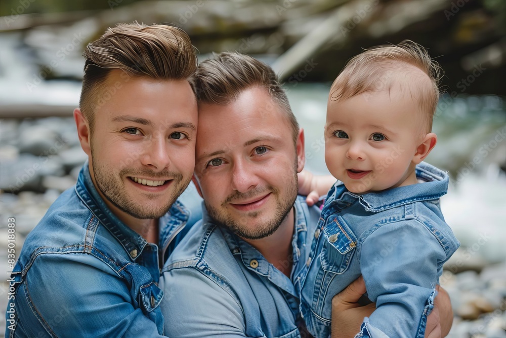 Related pictures for Focus A Two Handsome Gay Happy Face And Looking At Camera On The Center With Hold A Baby With
