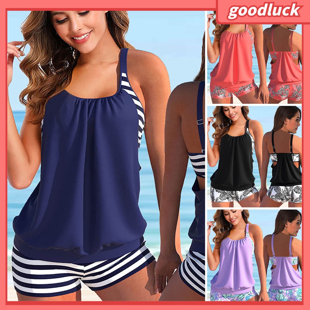 Tag : GDK 2 Pcs Set Beach Bikini Set Flower Print Solid Color U Neck Sleeveless Loose Swimming