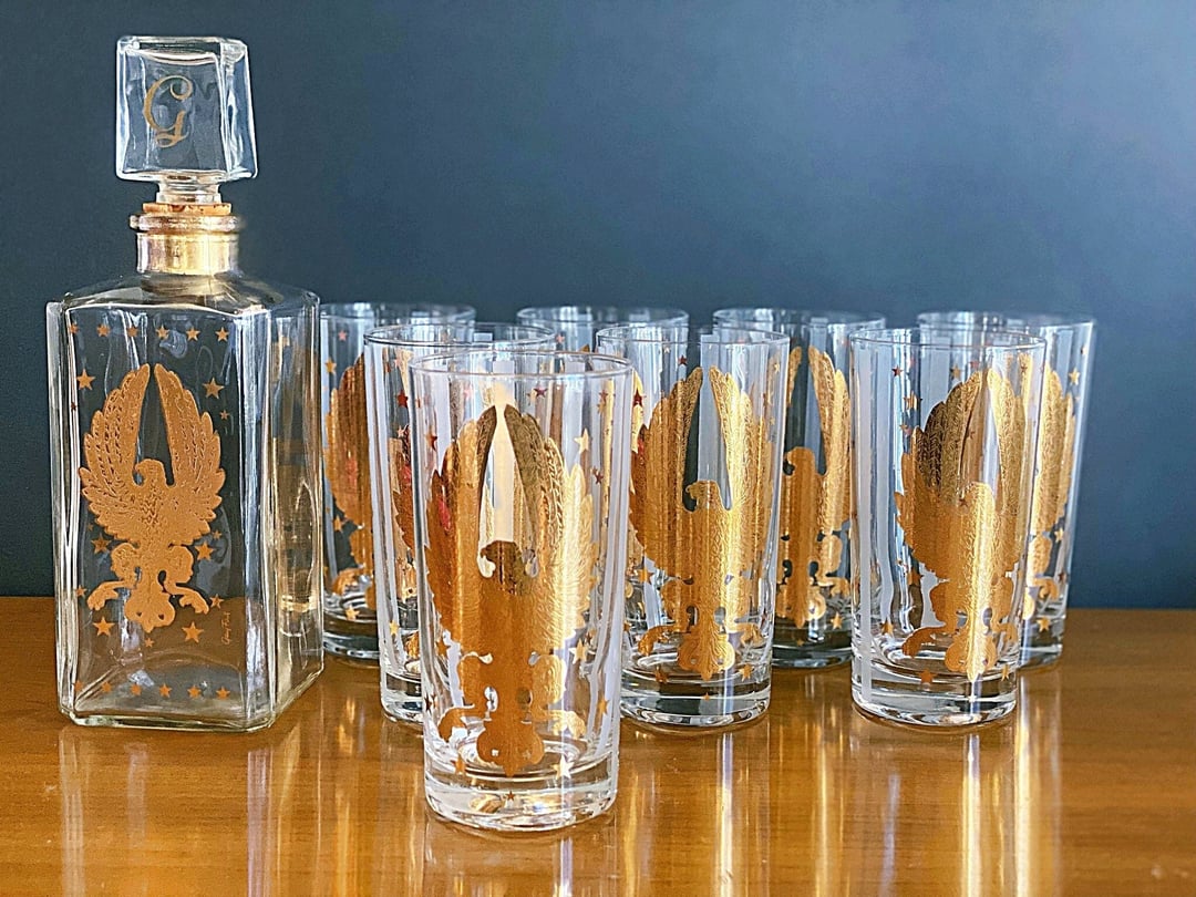 Tag : Gay Fad Mid Century Barware Decanter Set W Glasses Gold Vintage Biffann Cincinnati OH