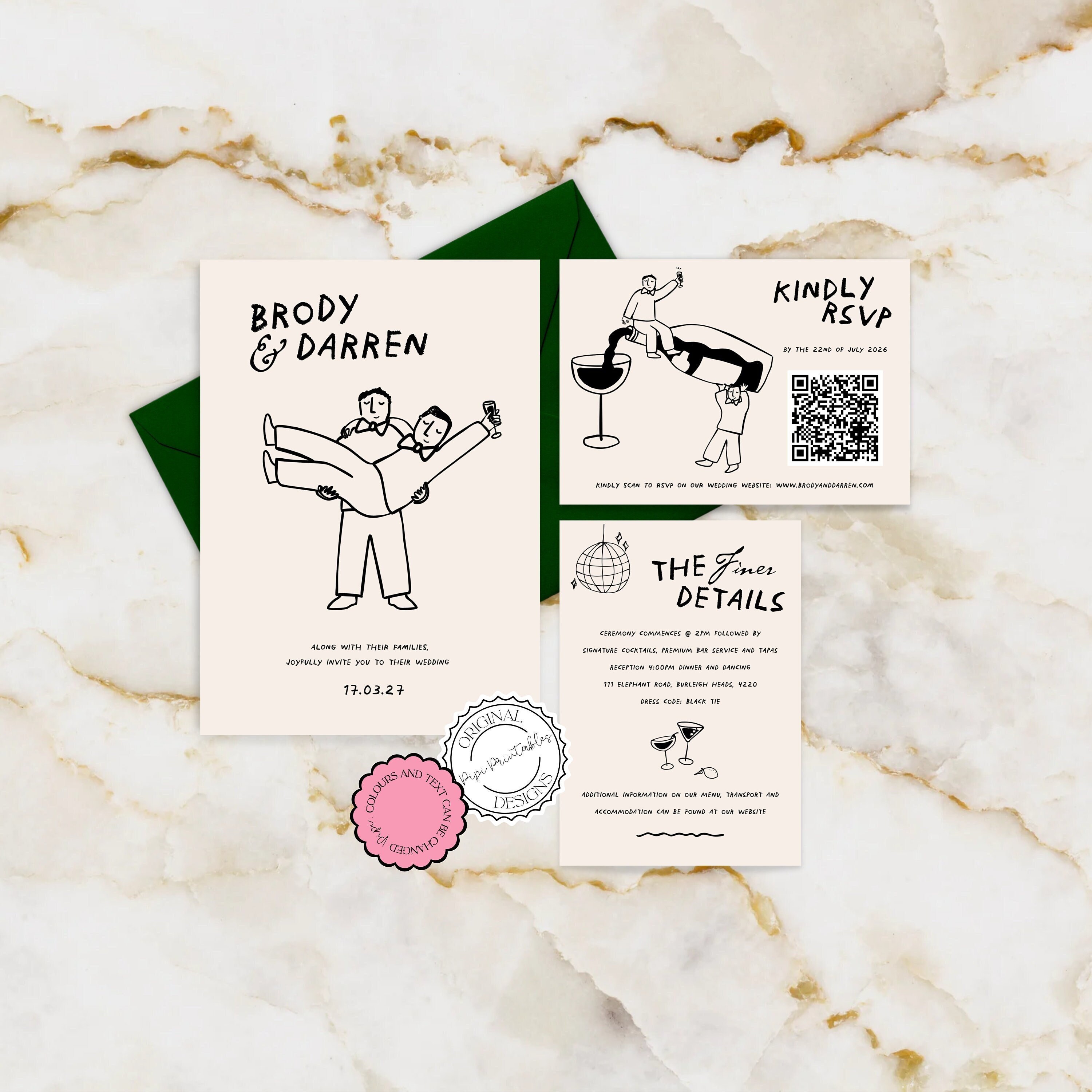 Tag : Gay Wedding Invitation Set Template Mr Mr Cute People Hand Drawn Scribble Illustration Fun