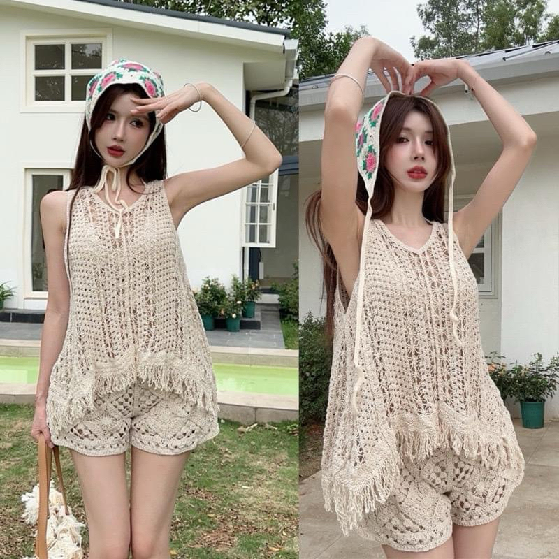 Related pictures for Giá sỉ Set bikini món len móc bộ bơi chi tiết đi biển áo tanktop tua rua mix quần sóc