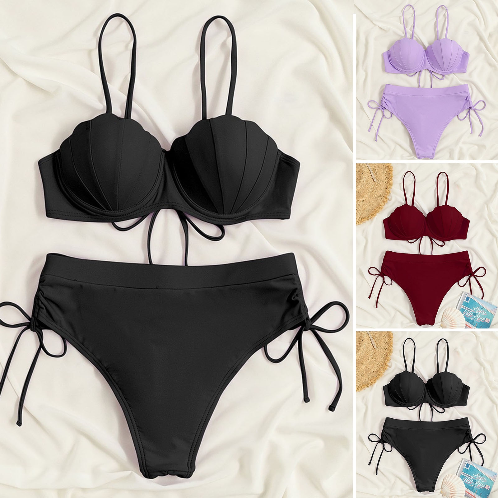 Guiexla Spaghetti Straps Side Drawstring Ruched Sexy Bikini Set Mermaid Underwire Bra High Waist is a popular picture for sexy and hot.