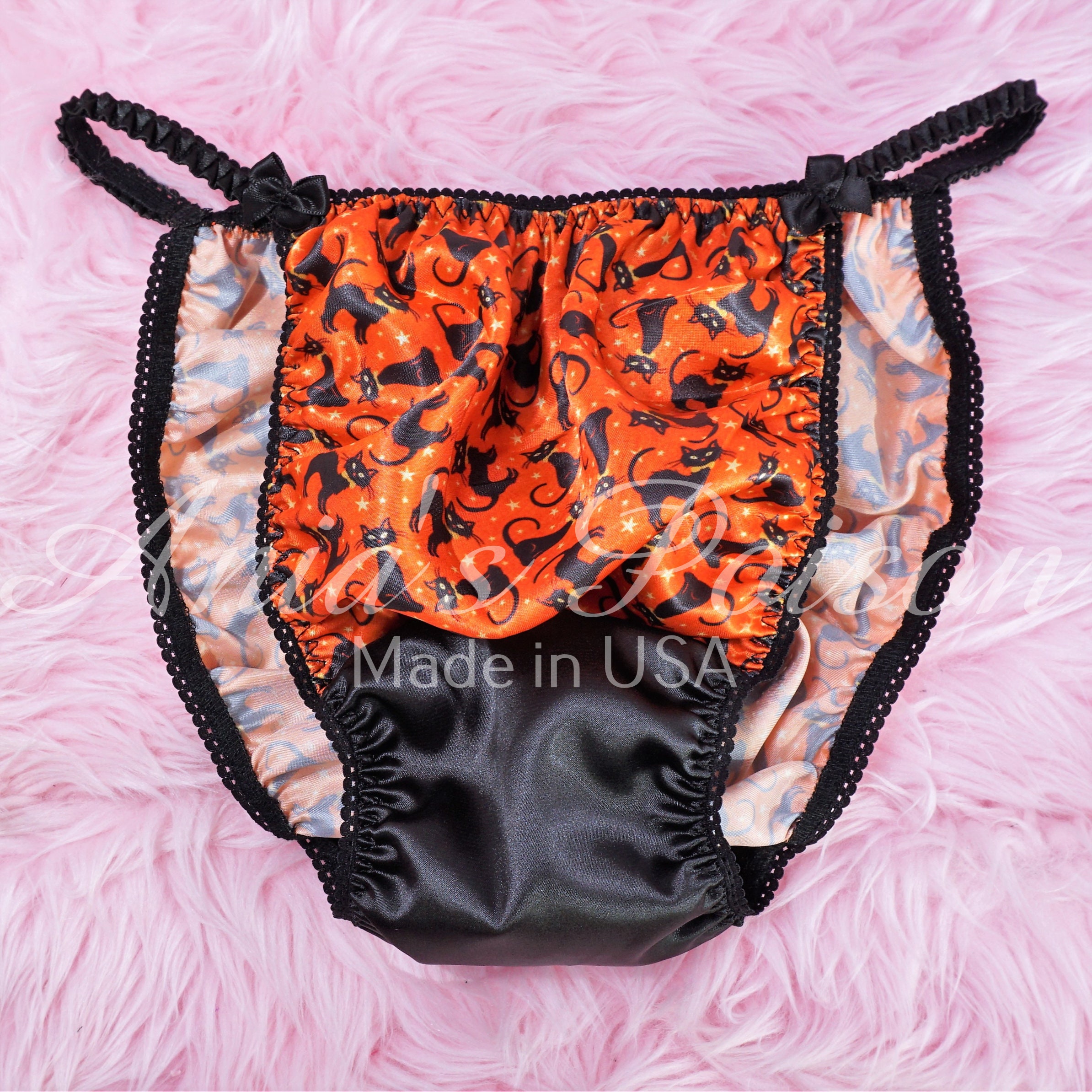 HALLOWEEN Panties Sissy Satin Underwear Spooky Orange Scaredy Cat String Bikini Shiny Mens is a popular picture for sexy and hot.