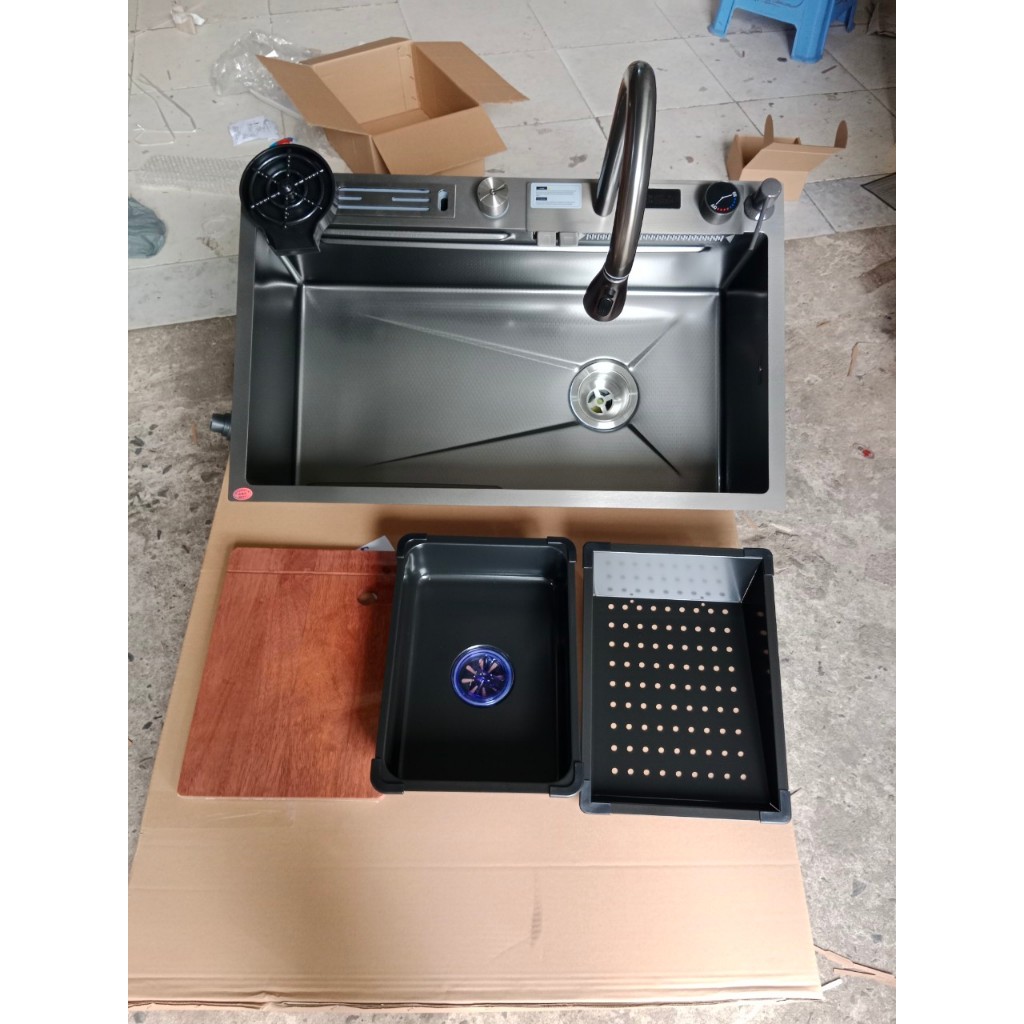 HOT NEW HIỂN THỊ NHIỆT ĐỘ Chậu rửa chén một hố lớn inox 304 phủ Nano Đen Cao Cấp 75 x46