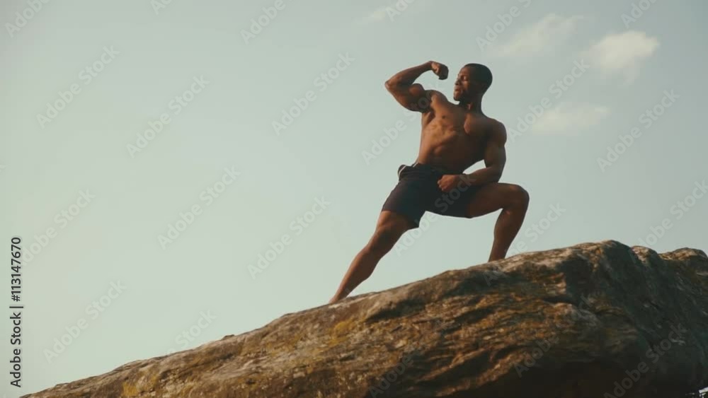 Tag : Handsome Smiling African American Body Builder With Naked Torso Posing On The Rock And Showing