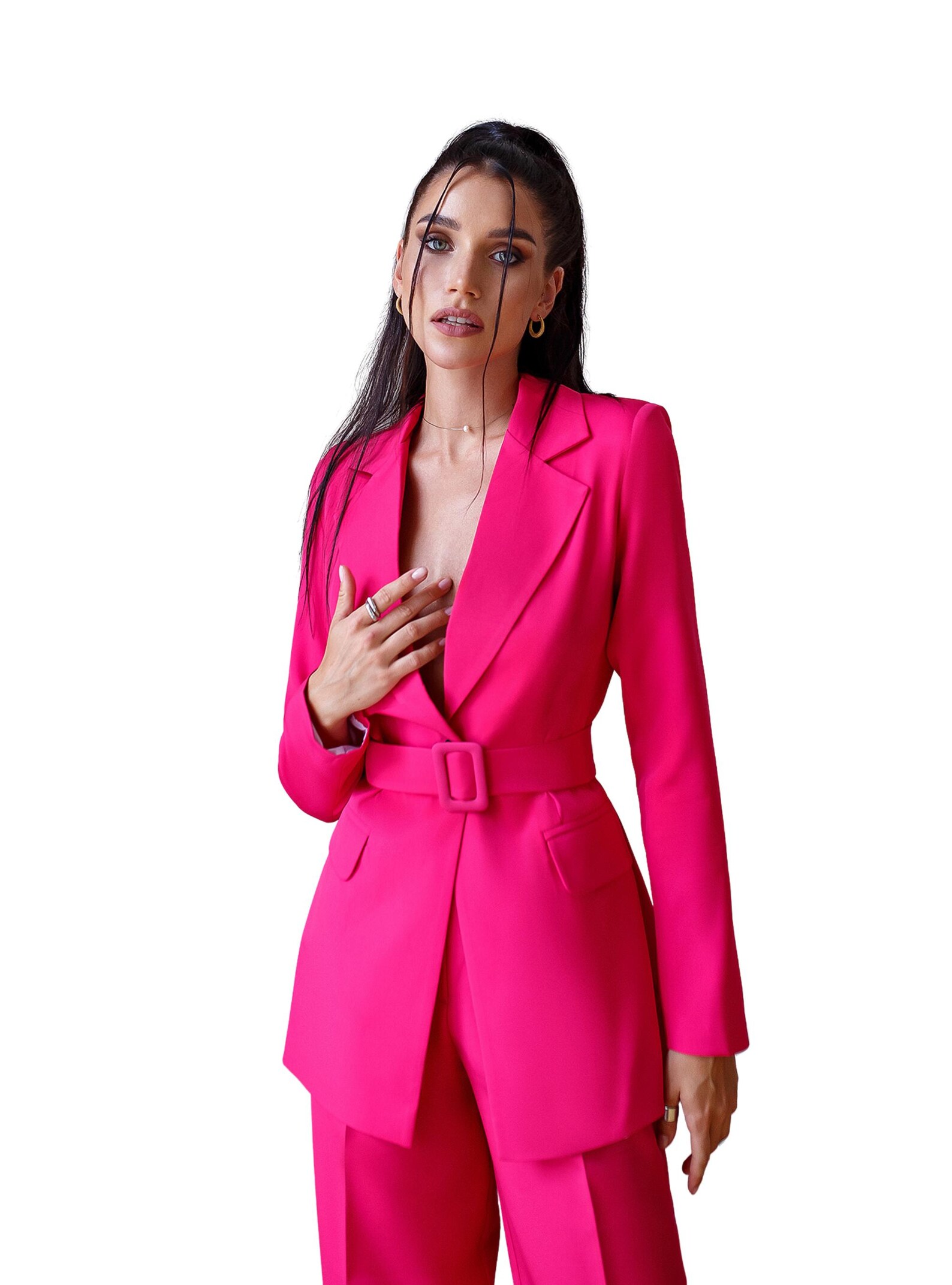 Hot Pink 2 Piece Suit Set For Women Raspberry Pink Pantsuit With Belted Blazer And Wide Leg is a popular picture for sexy and hot.