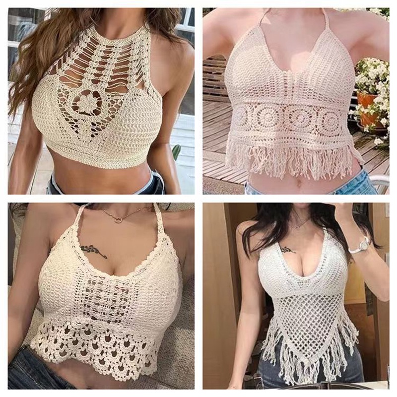Tag : INS Fashion Female Crochet Halter Sexy Tassels Bikini Camis Summer Beach Padded Crop Tops Tank