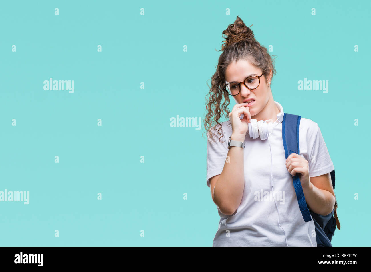 Tag : Jeune étudiante brunette girl wearing backpack et casque sur fond isolé à souligné et nerveux