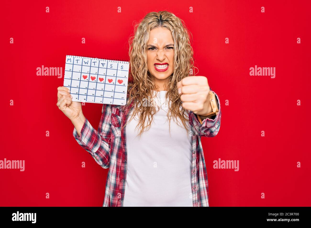 Jeune belle femme blonde tenant le calendrier de période contrôlant le cycle menstruel agacé et is a popular picture for sexy and hot.